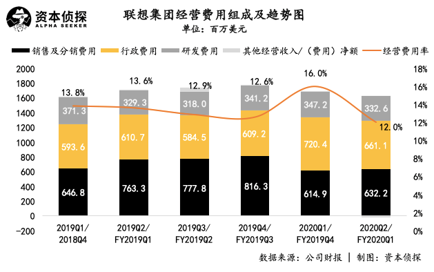 值得注意的是,在聯(lián)想的營收之路越走越寬的同時,其對于費用的控制也沒有落下。