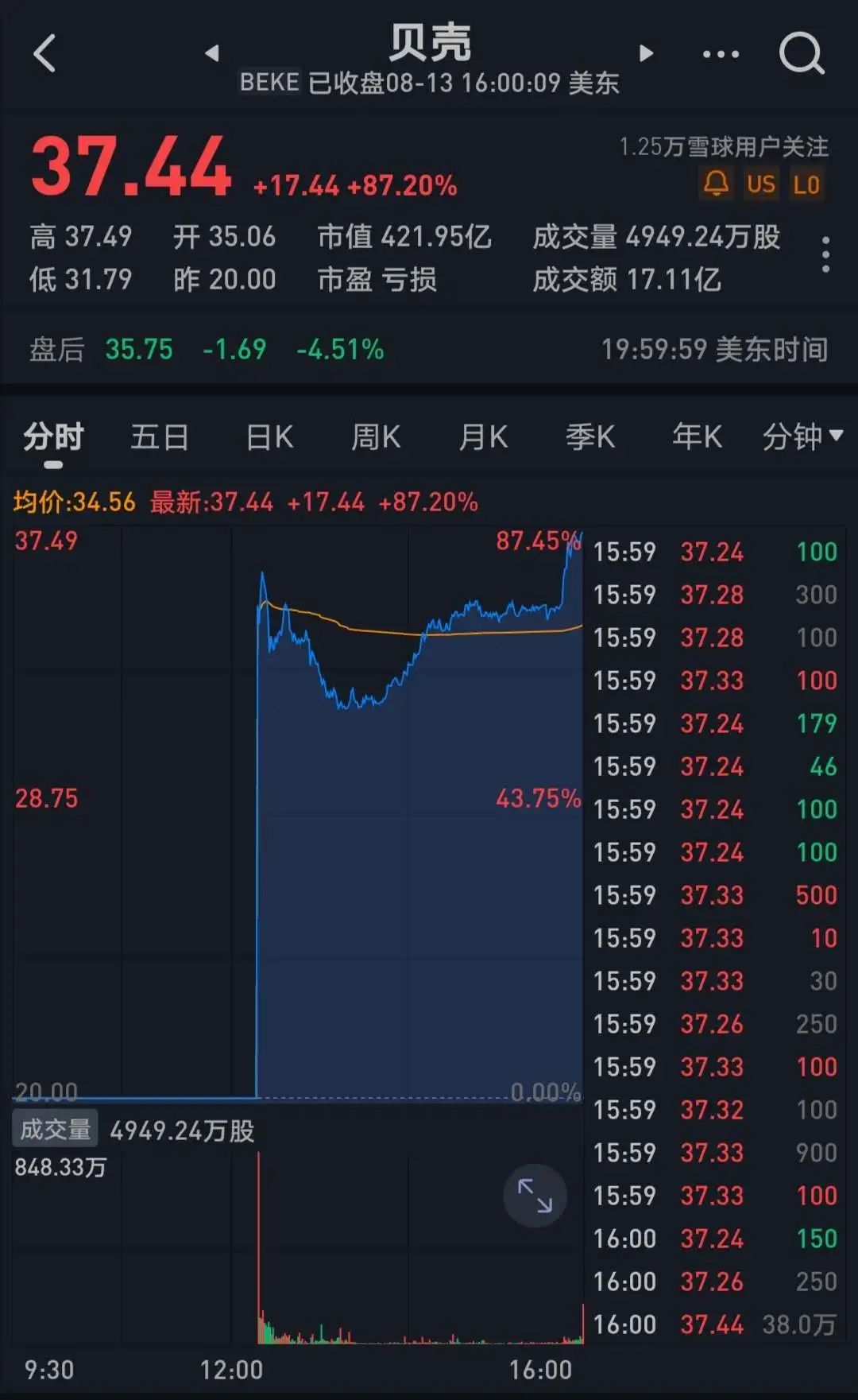 上市首日,貝殼開(kāi)盤(pán)價(jià)報(bào)35.06美元,開(kāi)盤(pán)即大漲75%,最終收?qǐng)?bào)37.44美元,收漲87.20%,市值突破420億美元。