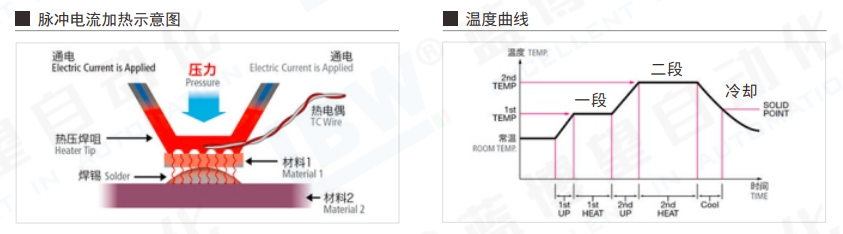 原理:焊接時對焊接部位加壓狀態下,迅速進行加熱而后快速冷卻,可防止結合部的浮起、虛焊, 對溫度時間等參數加以高精度地控制,使焊接具有良好的重復性,實現高品質的生產。